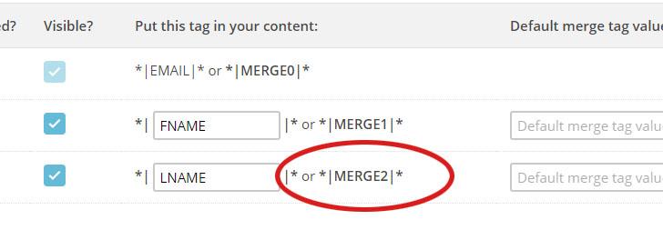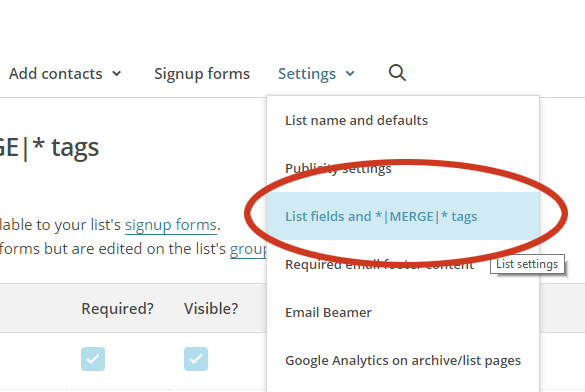 1) Go to your Mailchimp -> Lists and select the list you want to send data. In settings select on List fields and *|MERGE|* tags.