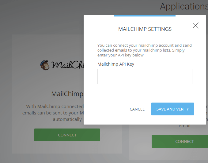 To connect Mailchimp to your website you need to go to Dashboard and select Applications. After that click on Connect to open the popup with Mailchimp API Key field.
